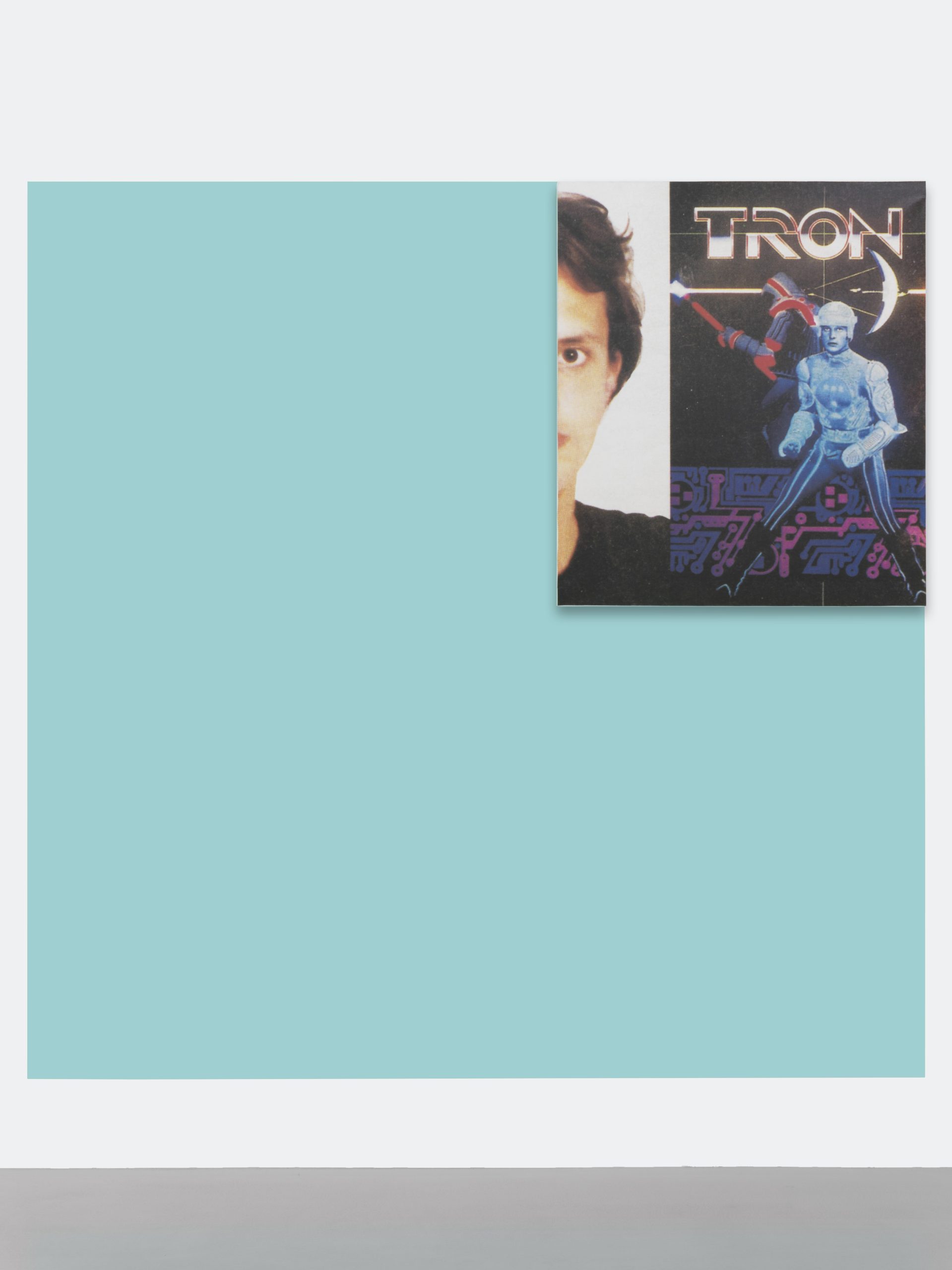 The large monochrome color fields of the Tron works are painted directly onto the wall in bright hues drawn from the Pantone palette. In the upper right corner of each, a silkscreen print is mounted, juxtaposing a promotional image from the Disney film TRON (1982) with a cropped portrait of the Berlin hacker Boris Floricic, who used the pseudonym TRON. The sequential numbering in the titles of the works, the Pantone color codes and the serially produced screen prints evoke technical manufacturing processes that, in combination with the abstract color fields, challenge the conventional notion of painting. At the same time, the motifs evoke tech subcultures, cinematic imagination, digital gaming worlds, and their grounding in reality. The serial conception and the spatially expansive installation generate a dense field of tension in which references circulate as a distinct and processual material.